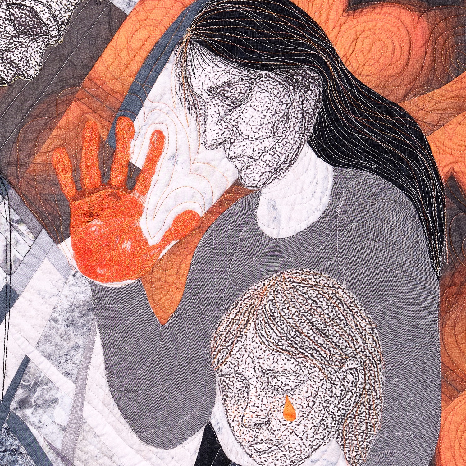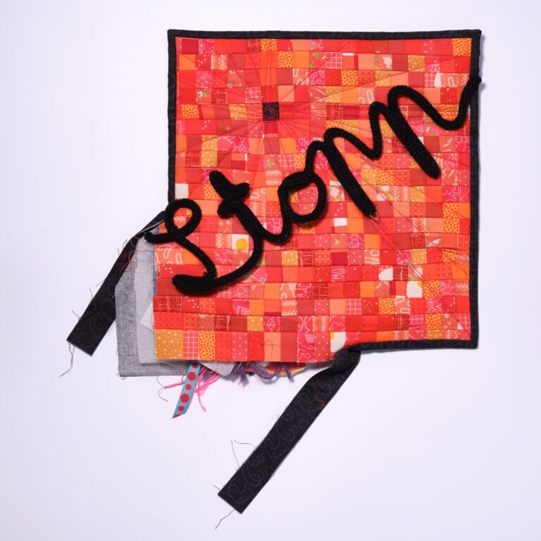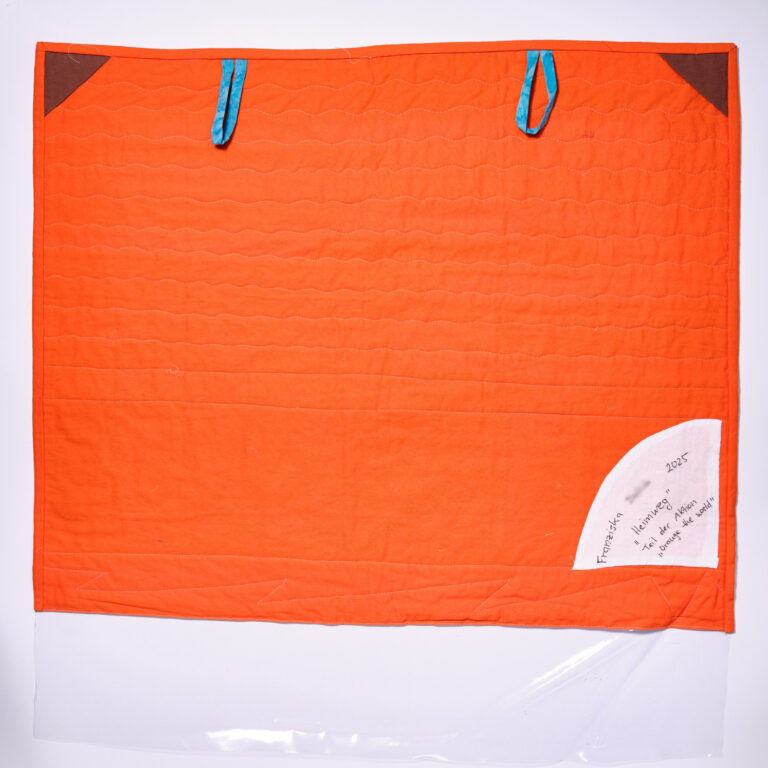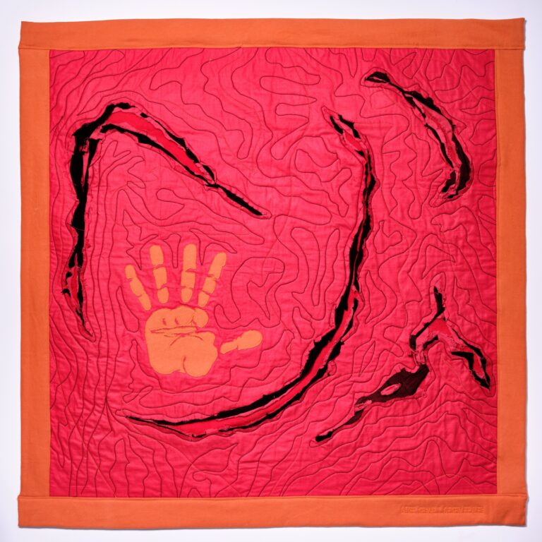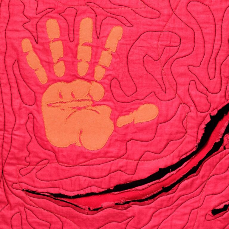 Die orangefarbene Hand erhebt sich als stummer Protest, ein „Stopp“, das zu oft ungehört verhallt. Roter, aufgerissener Stoff steht für sichtbare und unsichtbare Verletzungen. Darunter verbergen sich Schichten aus Wolle, Baumwolle und zerschnittenen Feinstrumpfhosen – zarte, intime Materialien, durchzogen von Schmerz und Erinnerung.