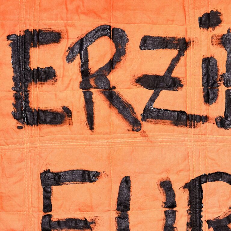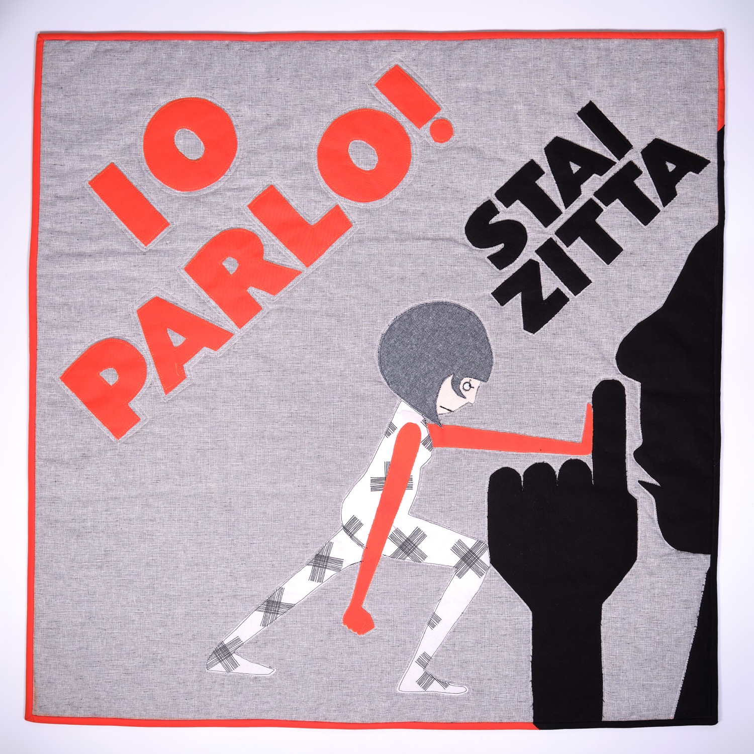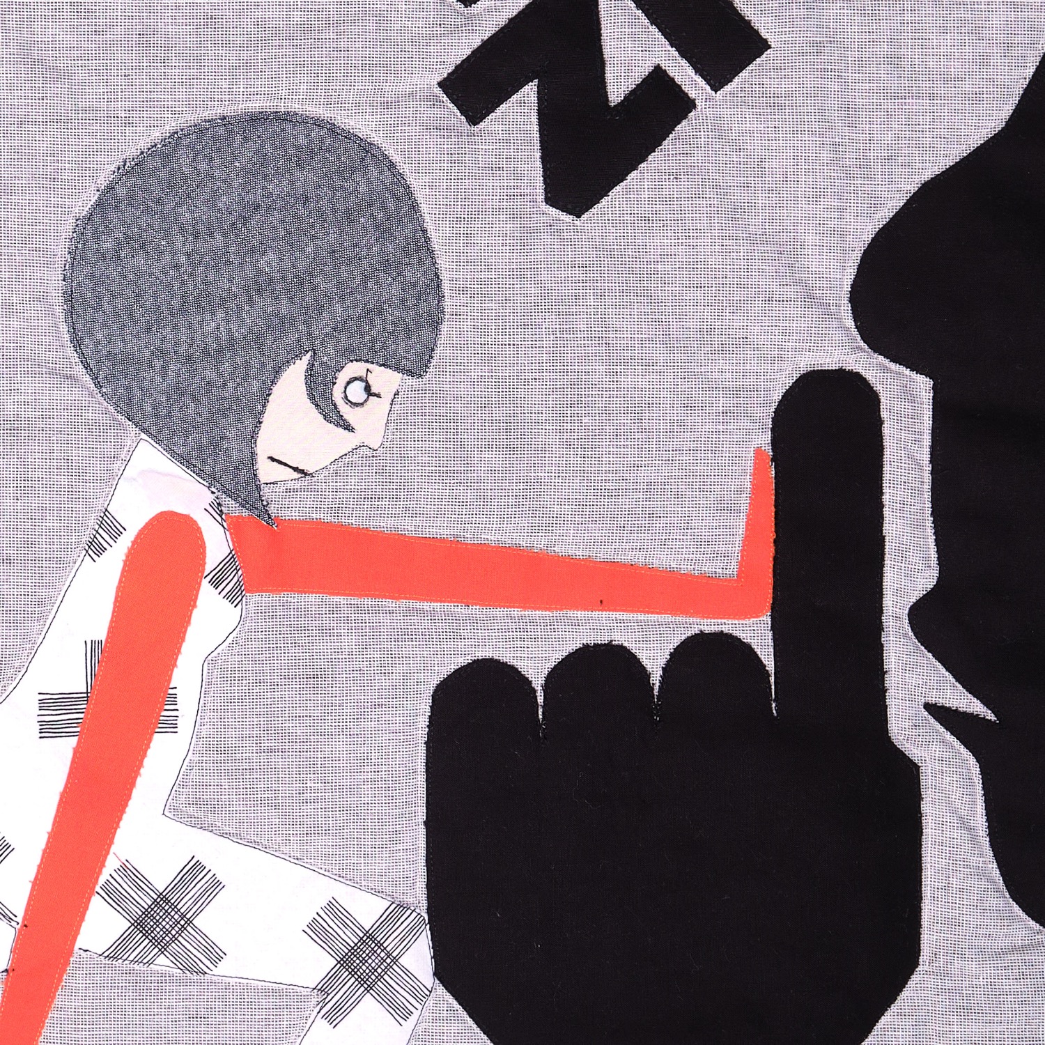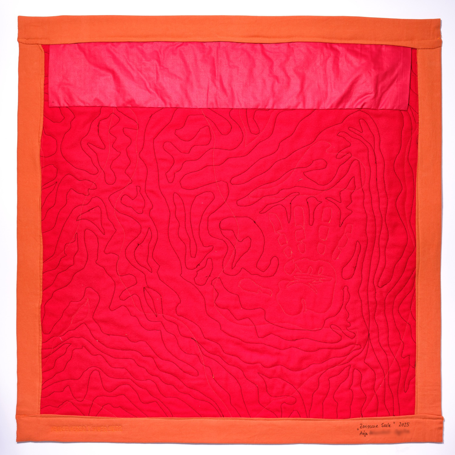 Die orangefarbene Hand erhebt sich als stummer Protest, ein „Stopp“, das zu oft ungehört verhallt. Roter, aufgerissener Stoff steht für sichtbare und unsichtbare Verletzungen. Darunter verbergen sich Schichten aus Wolle, Baumwolle und zerschnittenen Feinstrumpfhosen – zarte, intime Materialien, durchzogen von Schmerz und Erinnerung.