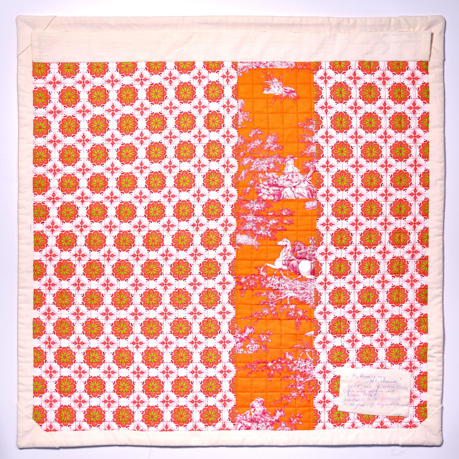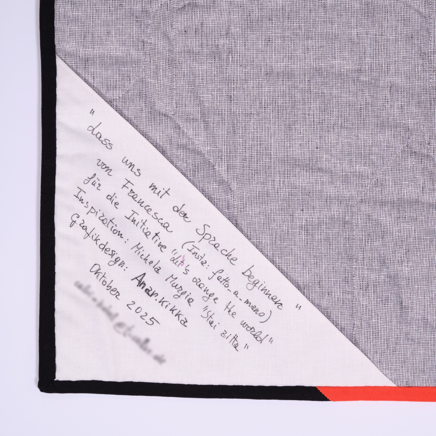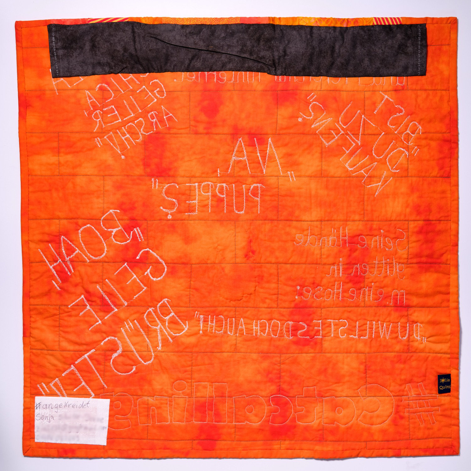 Verschiedene orangenfarbige Bw.Stoffe wurden aneinandergenäht und immer wieder zerschnitten,wieder zusammen genäht,mit der Maschinegequiltet, und den Text aufgestickt.