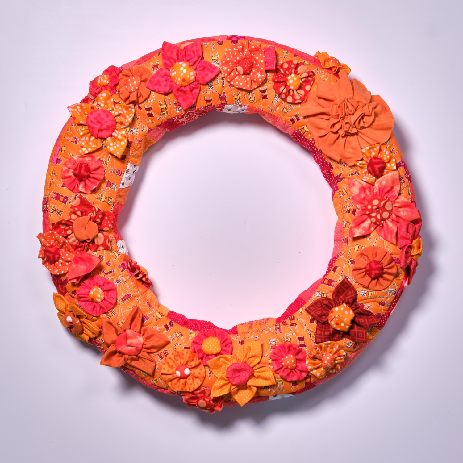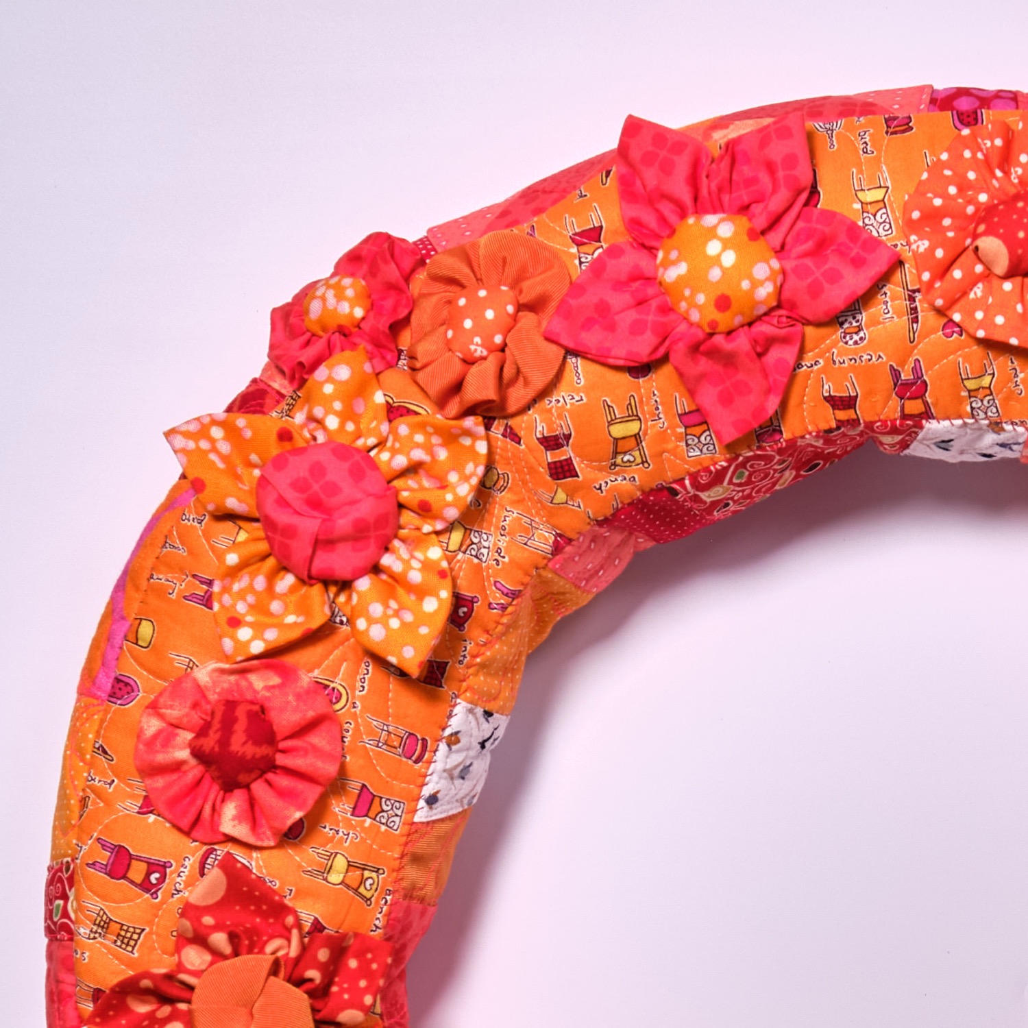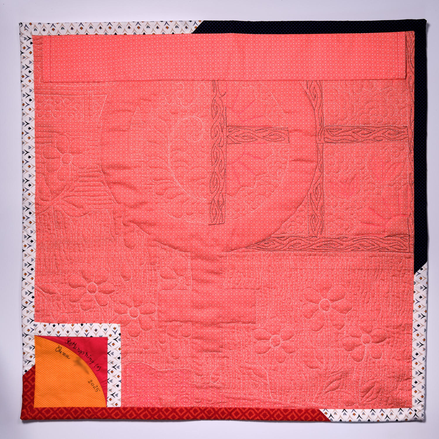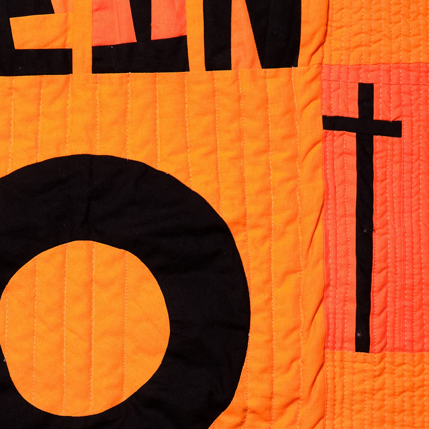 Verschiedene orangenfarbige Bw.Stoffe wurden aneinandergenäht und immer wieder zerschnitten,wieder zusammen genäht,mit der Maschinegequiltet, und den Text aufgestickt.