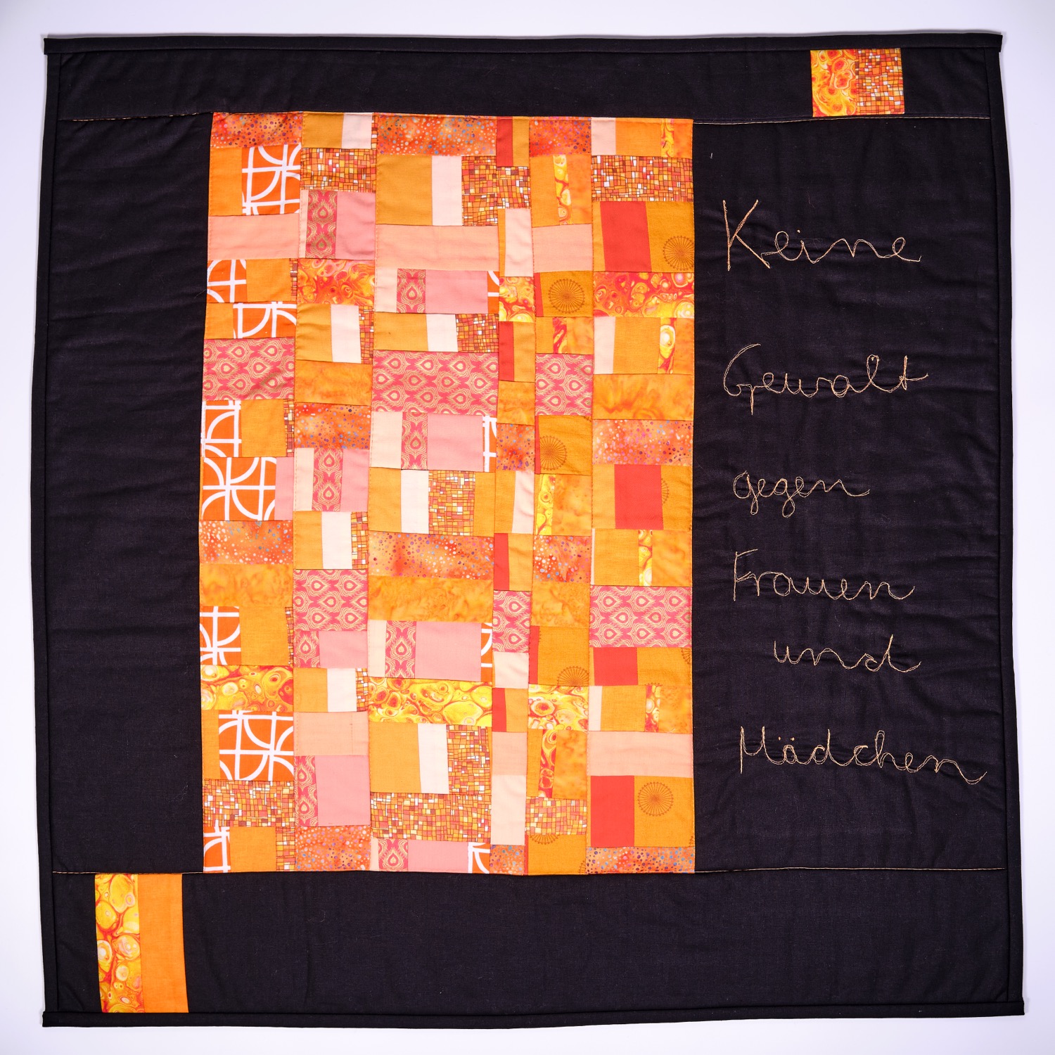 Mein Quilt soll dieses Statement klar und deutlich zeigen, sowohl die Tatsache, dass alle Frauen davon betroffen sind oder sein können, als auch die Wichtigkeit von Zusammenhalt und gemeinsamer Stärke und das laute und kraftvolle NEIN ! mit dem aus meiner Sicht alles beginnt.