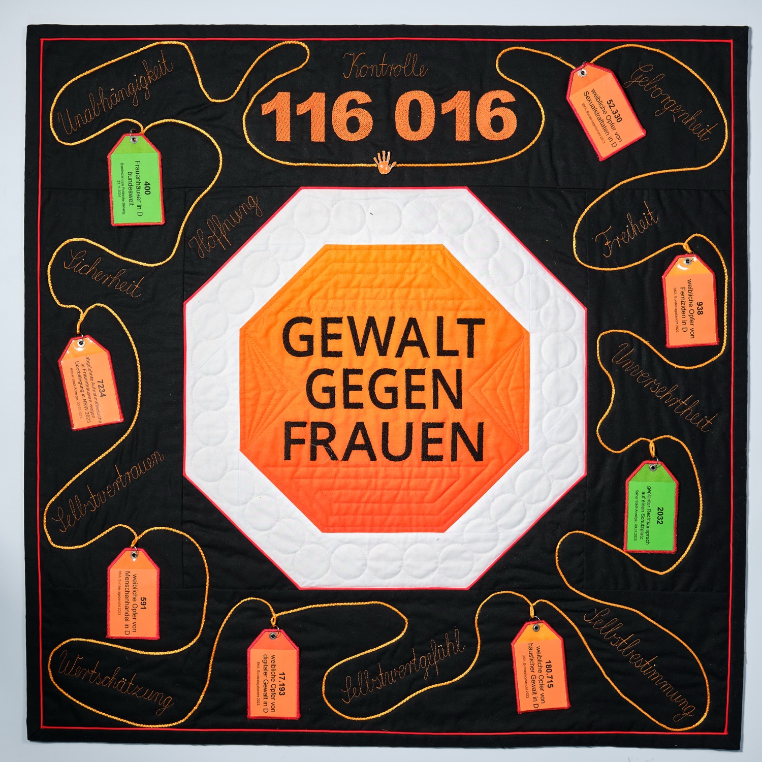 Die Worte Freiheit, Schutz, Mut, Frieden, Würde, Respekt, Gleichberechtigung und Zivilcourage habe ich in Stoff sichtbar gemacht. Sie stehen sinnbildlich für die vielen Stimmen, die sich gegen Gewalt erheben.