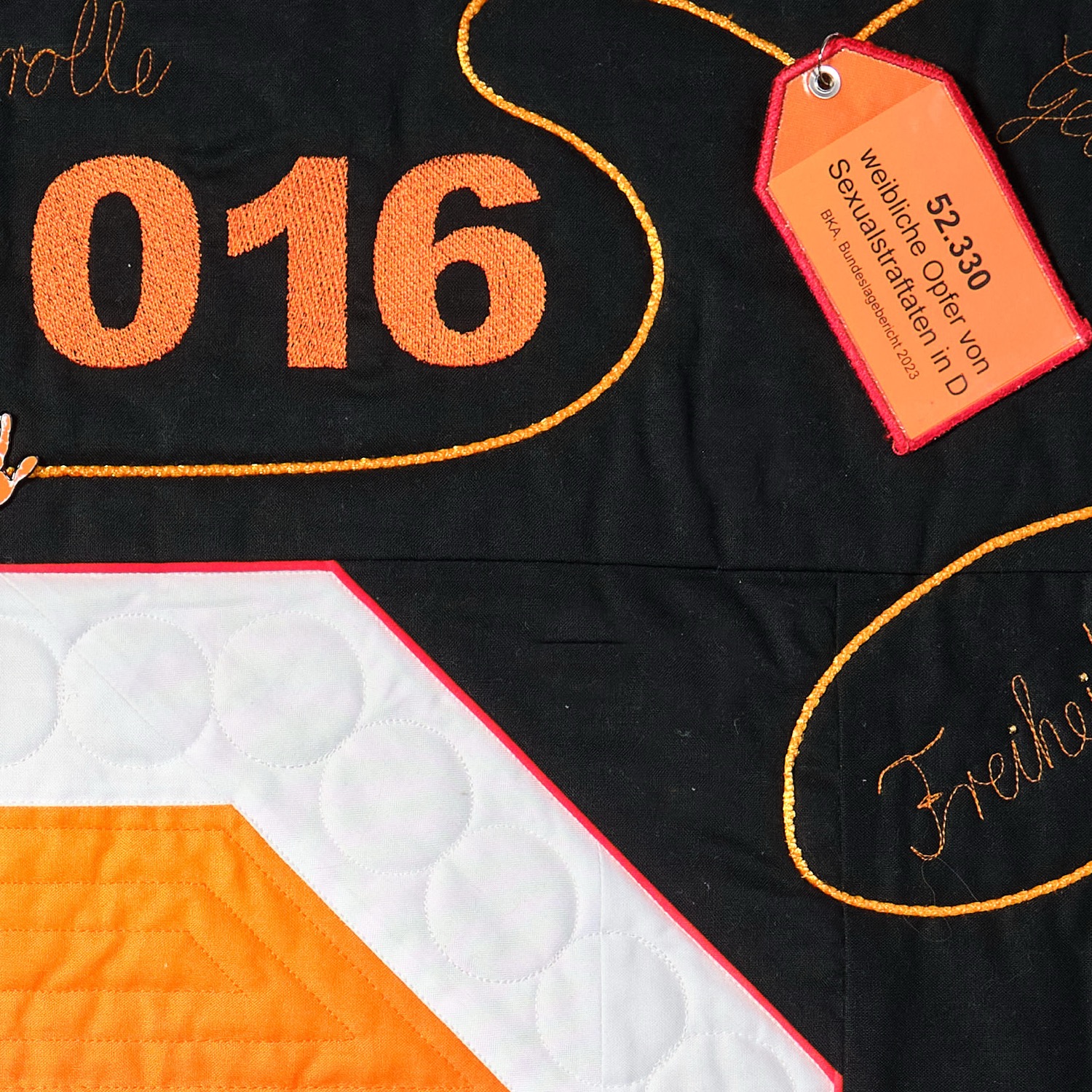 Als „zweite Ebene“ hat mein Quilt eine „orangene Brille“. Wenn man diese über den eigentlichen Quilt legt, dann kann man sehen, wer in diesem Quilt von häuslicher Gewalt betroffen ist.