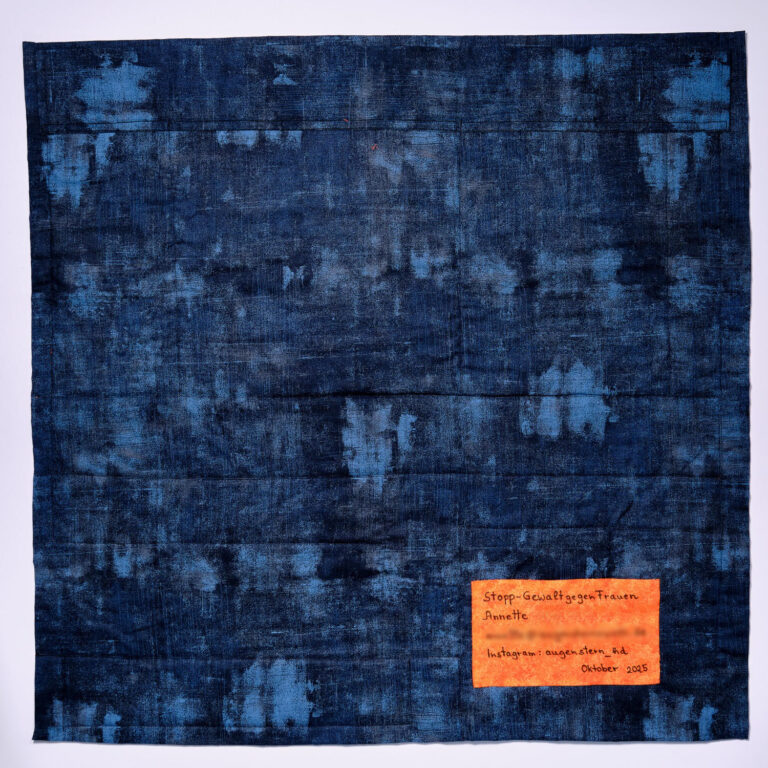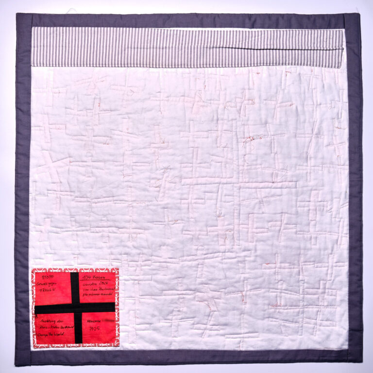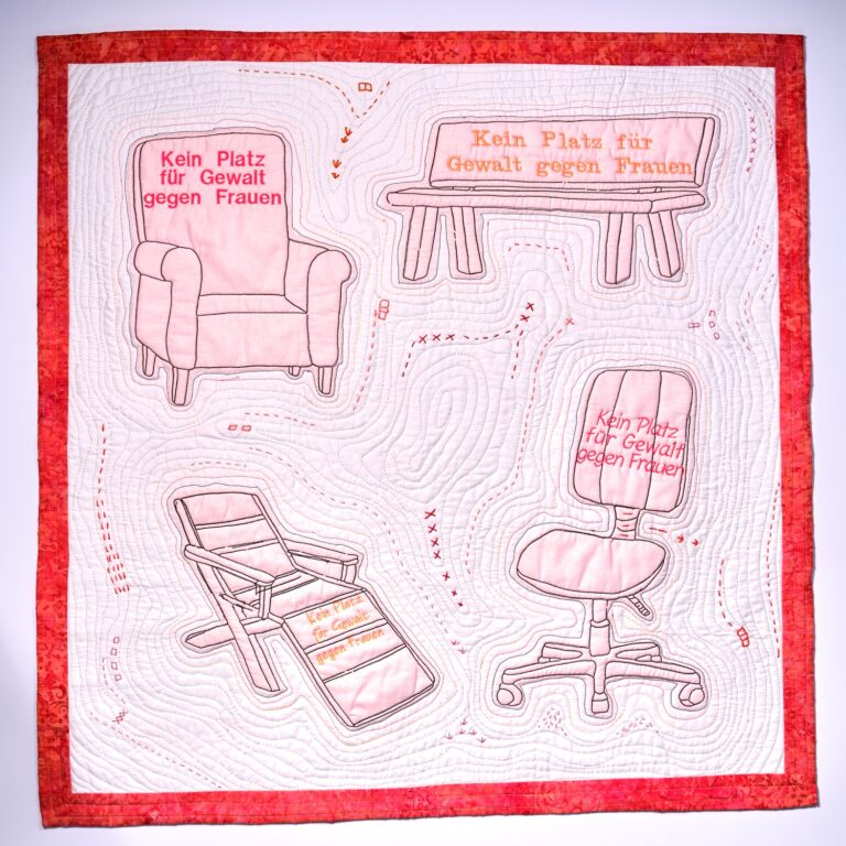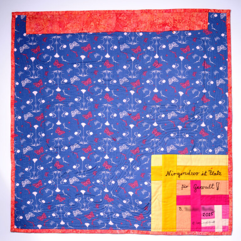 Bei der Planung unseres Standes auf der Nadelwelt 2025 war schnell klar, dass wir wie im Vorjahr Spenden für das Karlsruher Frauenhaus sammeln wollten. Karin Rische fragte uns, ob wir Platz für ihren Quilt zum Thema Gewalt gegen Frauen hätten, um damit dem Aufruf Nachdruck zu verleihen und die Spendenbereitschaft anzukurbeln.