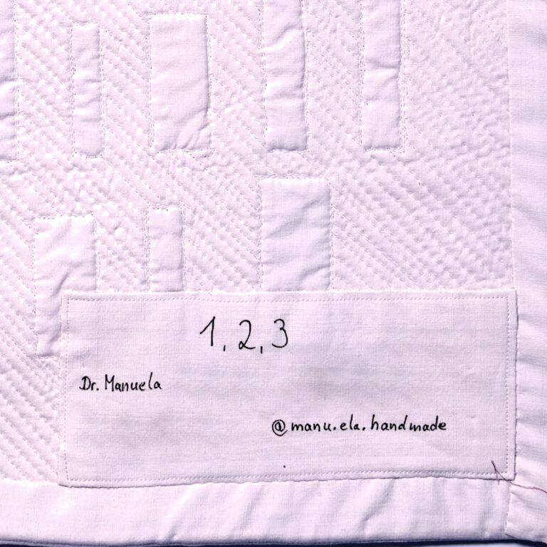 Druckbuchstaben und Zahlen wurden mit der Stickmaschine gefertigt. Linien und Kreise wurden mit dem Lineal, die Schreibschrift wurde freihand gequiltet.