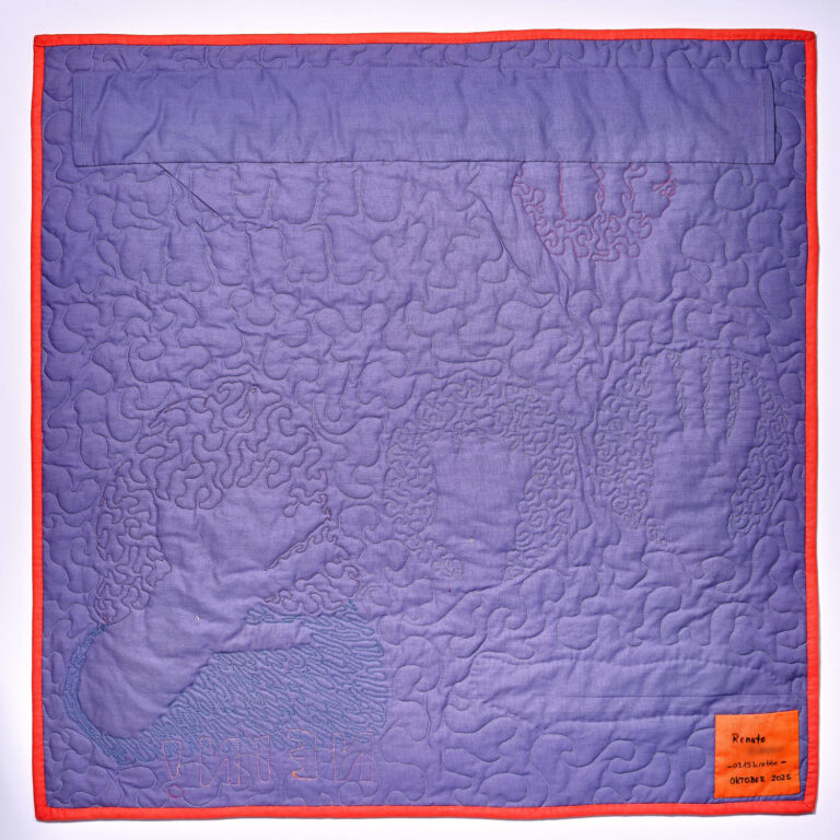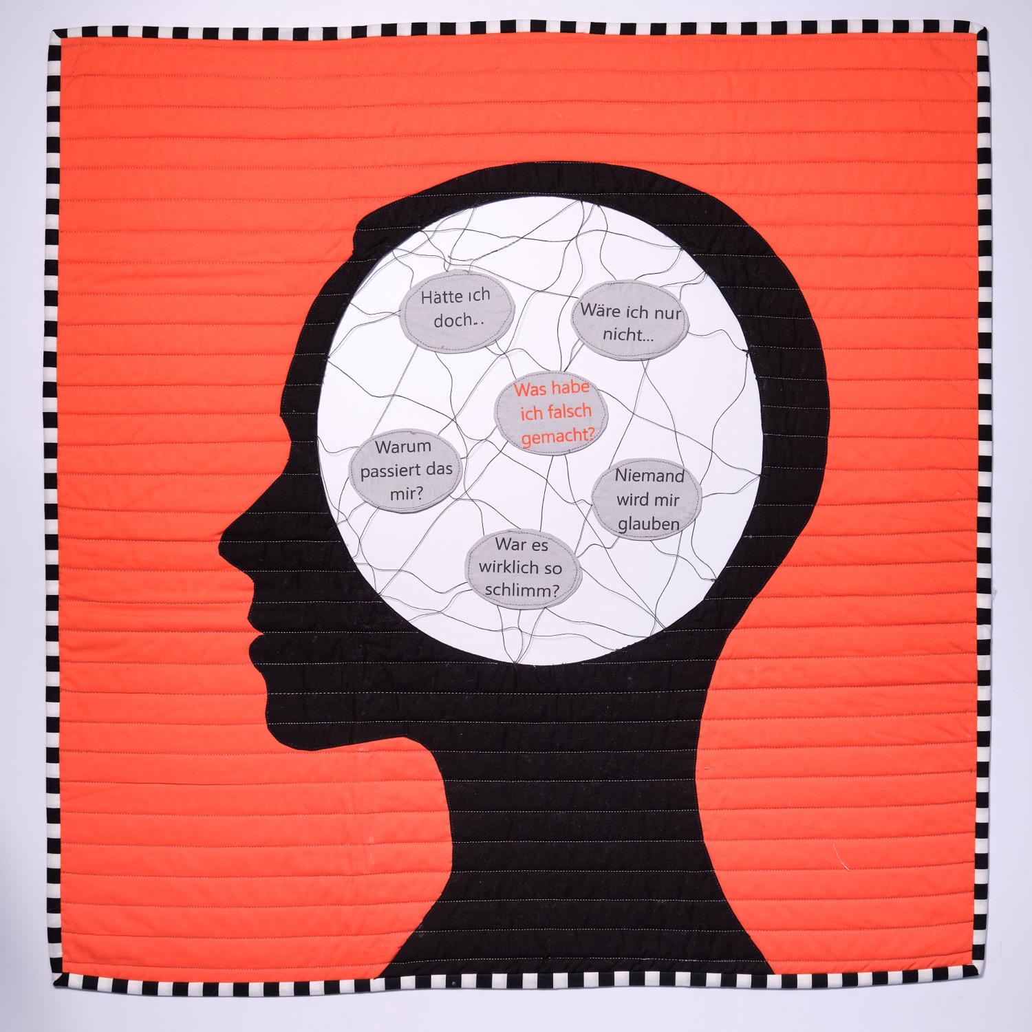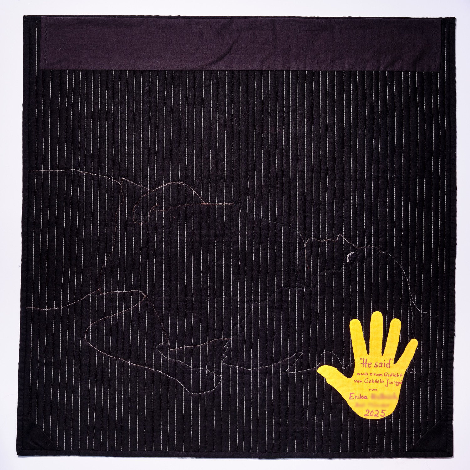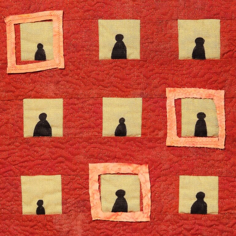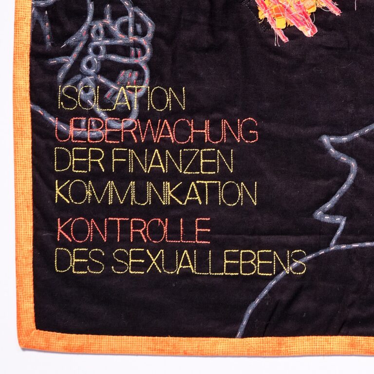 Die senkrechten dichten Quiltlinien fügen eine weitere Dimension hinzu: Wer Gewalt erfährt, lebt wie in einem Käfig von Scham und Verheimlichung.