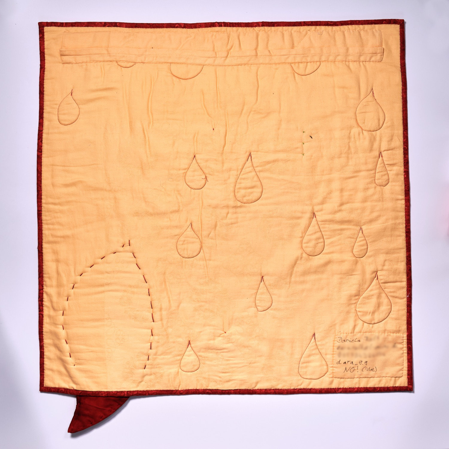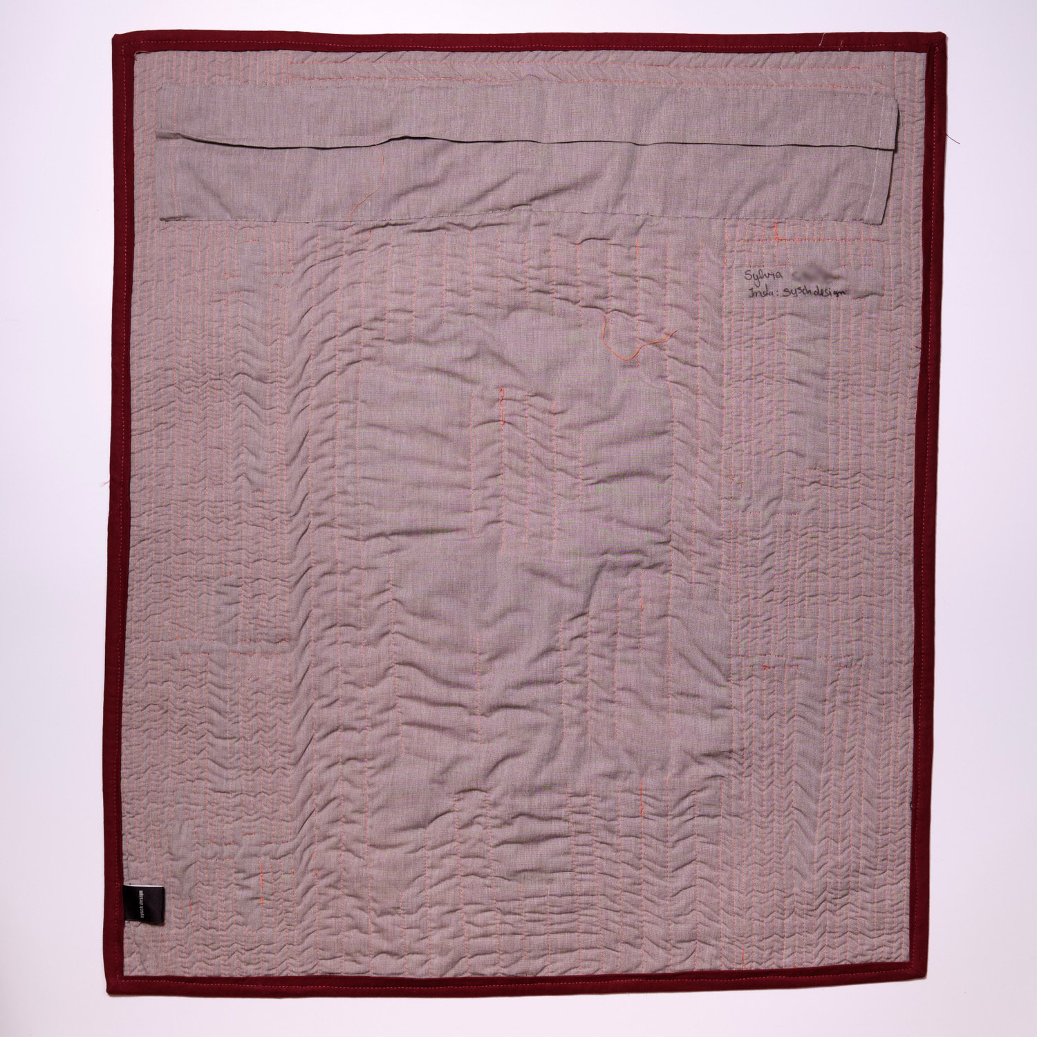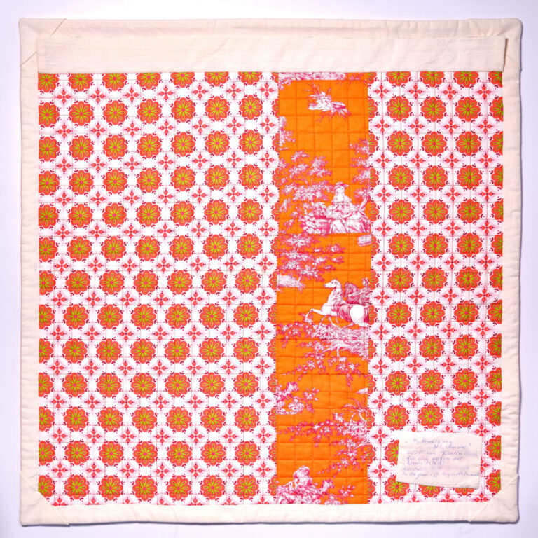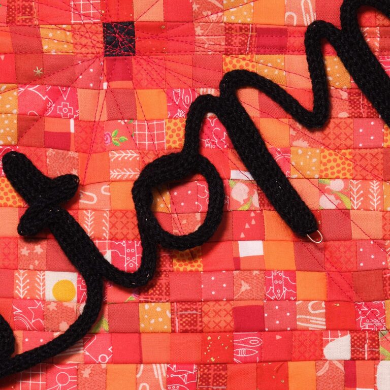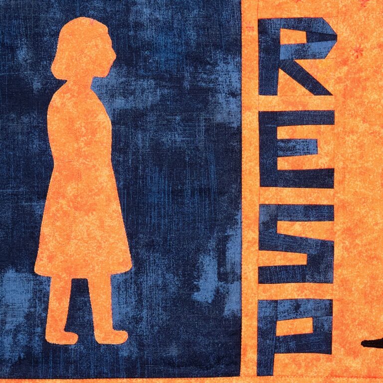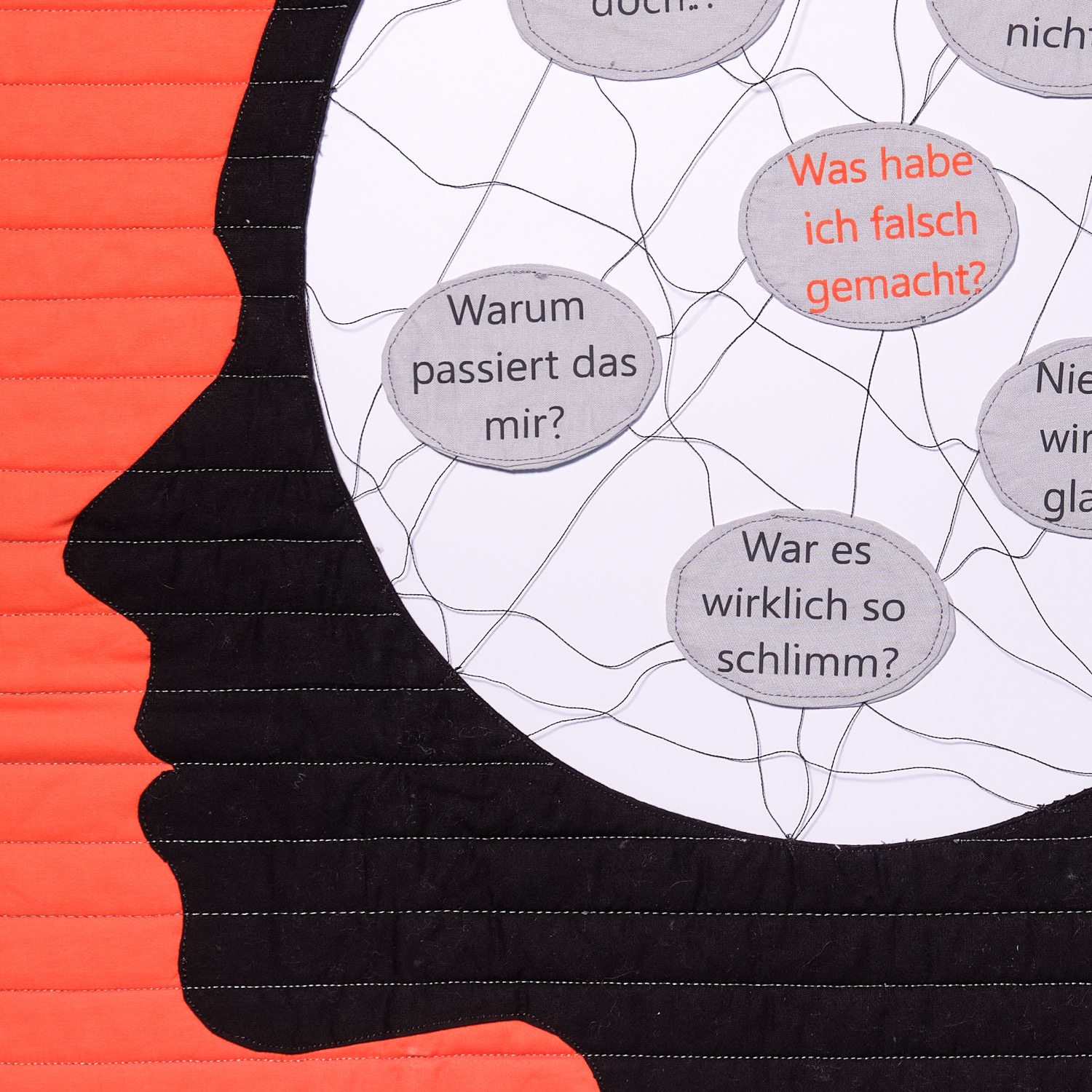 Die senkrechten dichten Quiltlinien fügen eine weitere Dimension hinzu: Wer Gewalt erfährt, lebt wie in einem Käfig von Scham und Verheimlichung.
