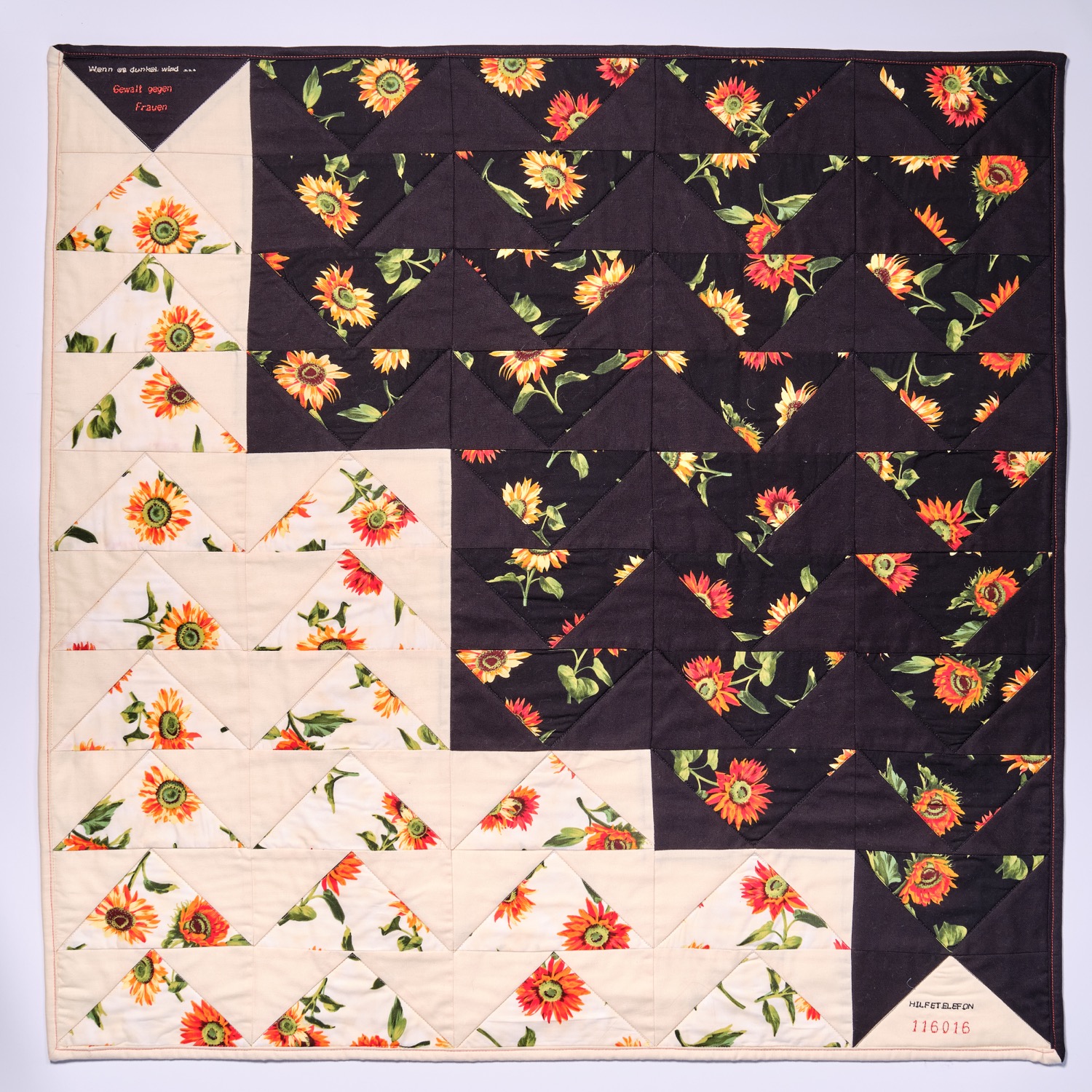 Der Quilt ist aus klassischen Flying Geese in Patchwork Piecing gestaltet. Am linken Rand gibt es noch viele helle mit leuchtenden Blumen. Doch nach rechts nehmen die dunklen schnell zu, erdrücken das Freundliche von oben mit den Spitzen nach unten, bis es fast ganz weg ist. Dies ist oft die Situation bei Opfern von häuslicher Gewalt.