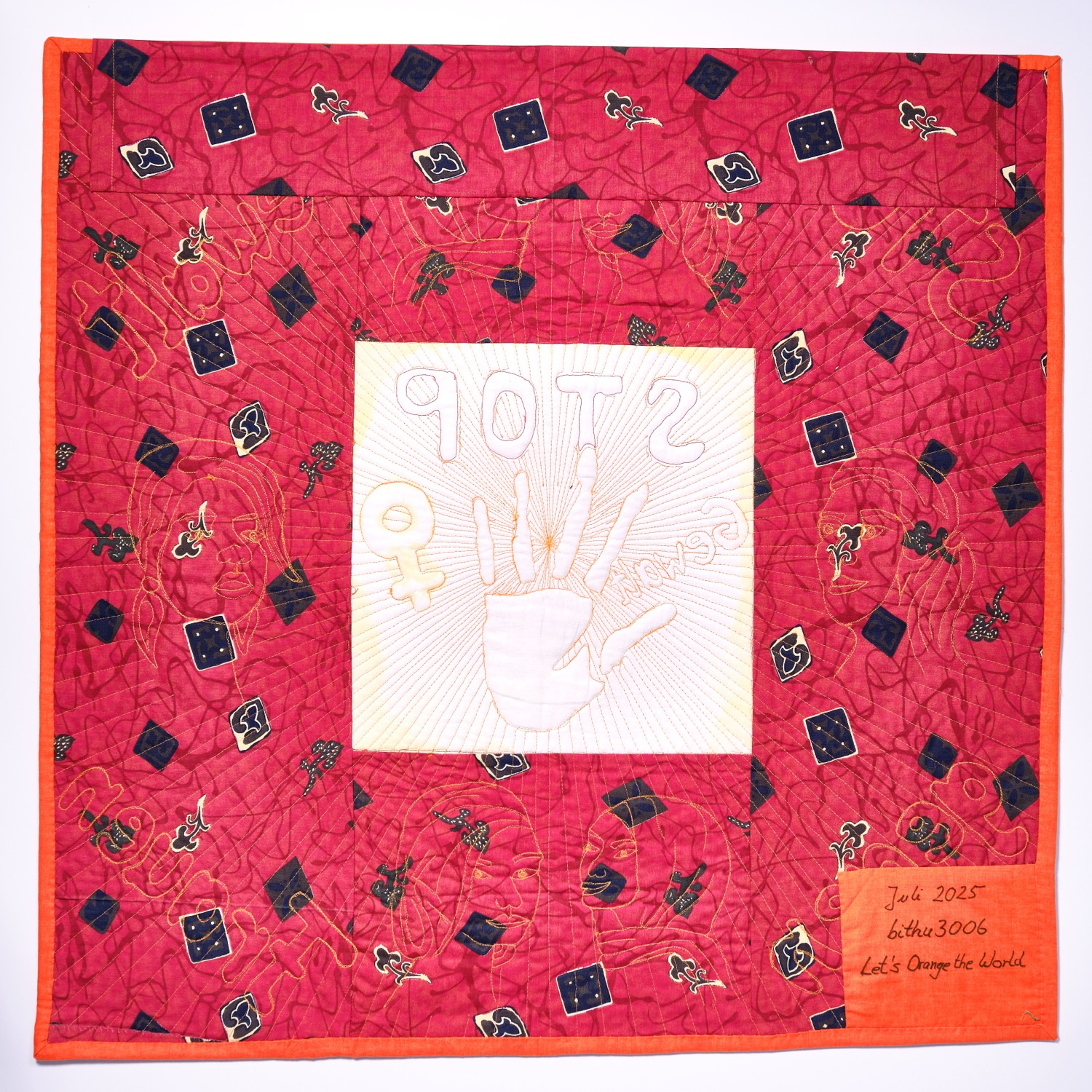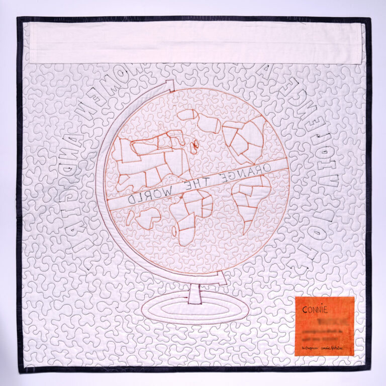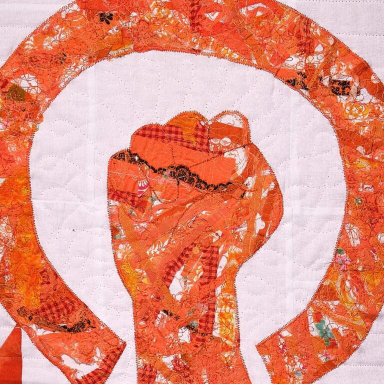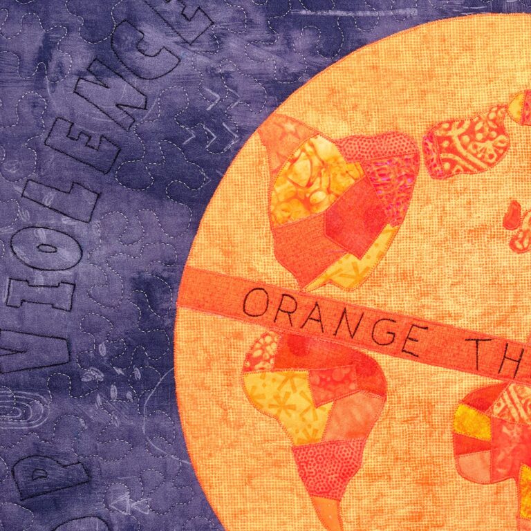 Die Vorgaben waren minimal: Nähe einen Quilt in der Größe 30×30 Inch zum Thema Gewalt gegen Frauen und verwende mehr oder weniger viel der Farbe Orange (die Signalfarbe steht für die Aktion “Orange the World“ von UN Woman)