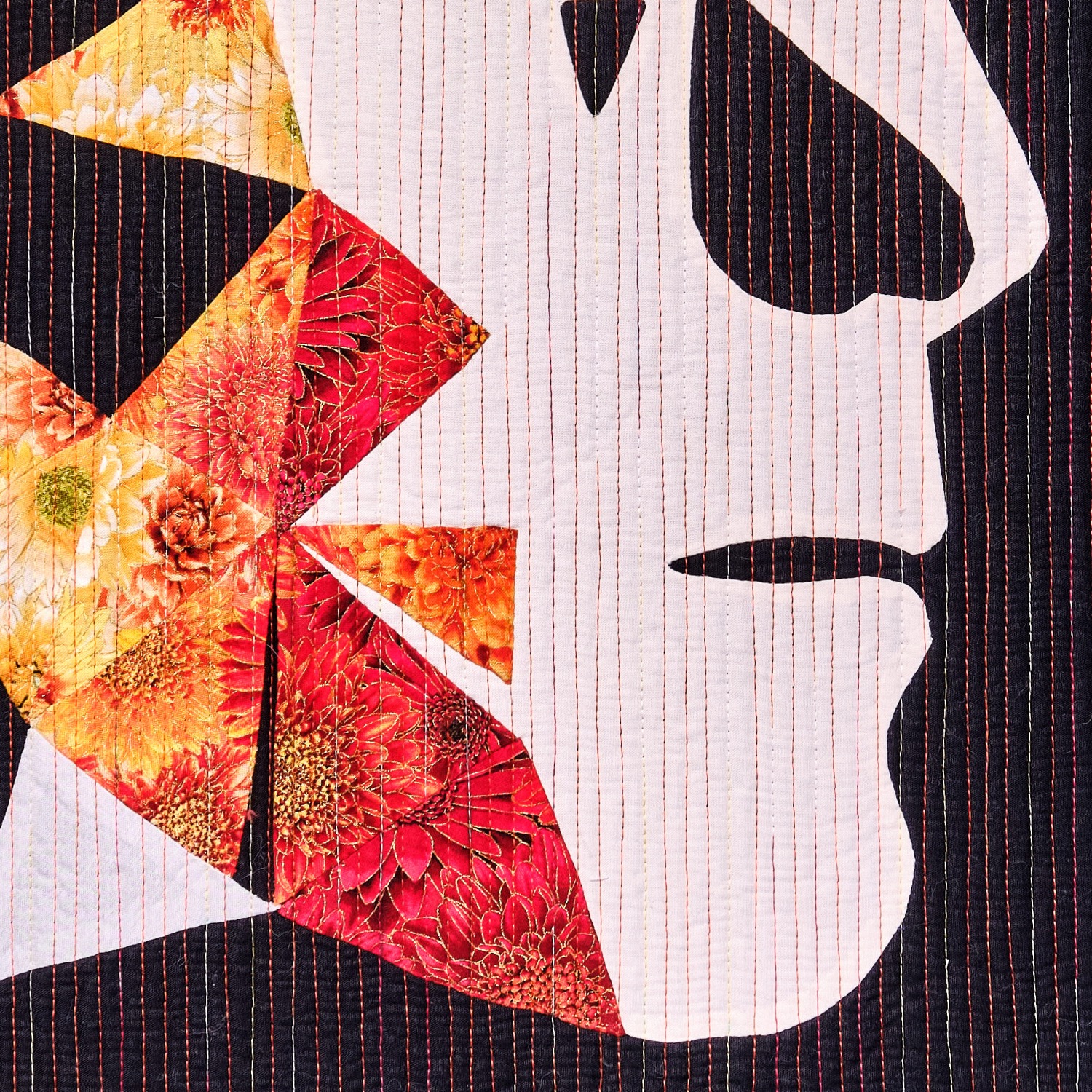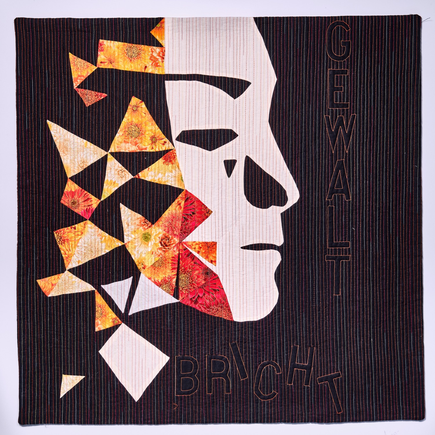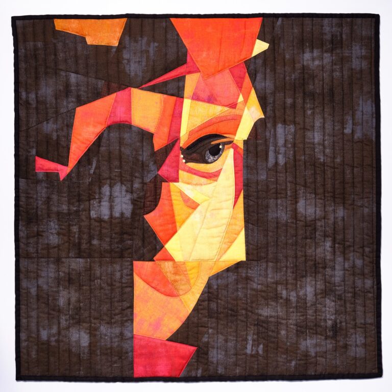 Auf dem schwarzen Hintergrund ist zuerst durch Applikation und Reversapplikation das Seitenprofil der Frau entstanden. Ihr weißes Gesicht zeigt: Es geht nicht um die eine Frau, sondern um viele. Mit Hilfe der English Paper Piecing Methode habe ich die farblichen Bruchstücke ihrer Persönlichkeit ergänzt.