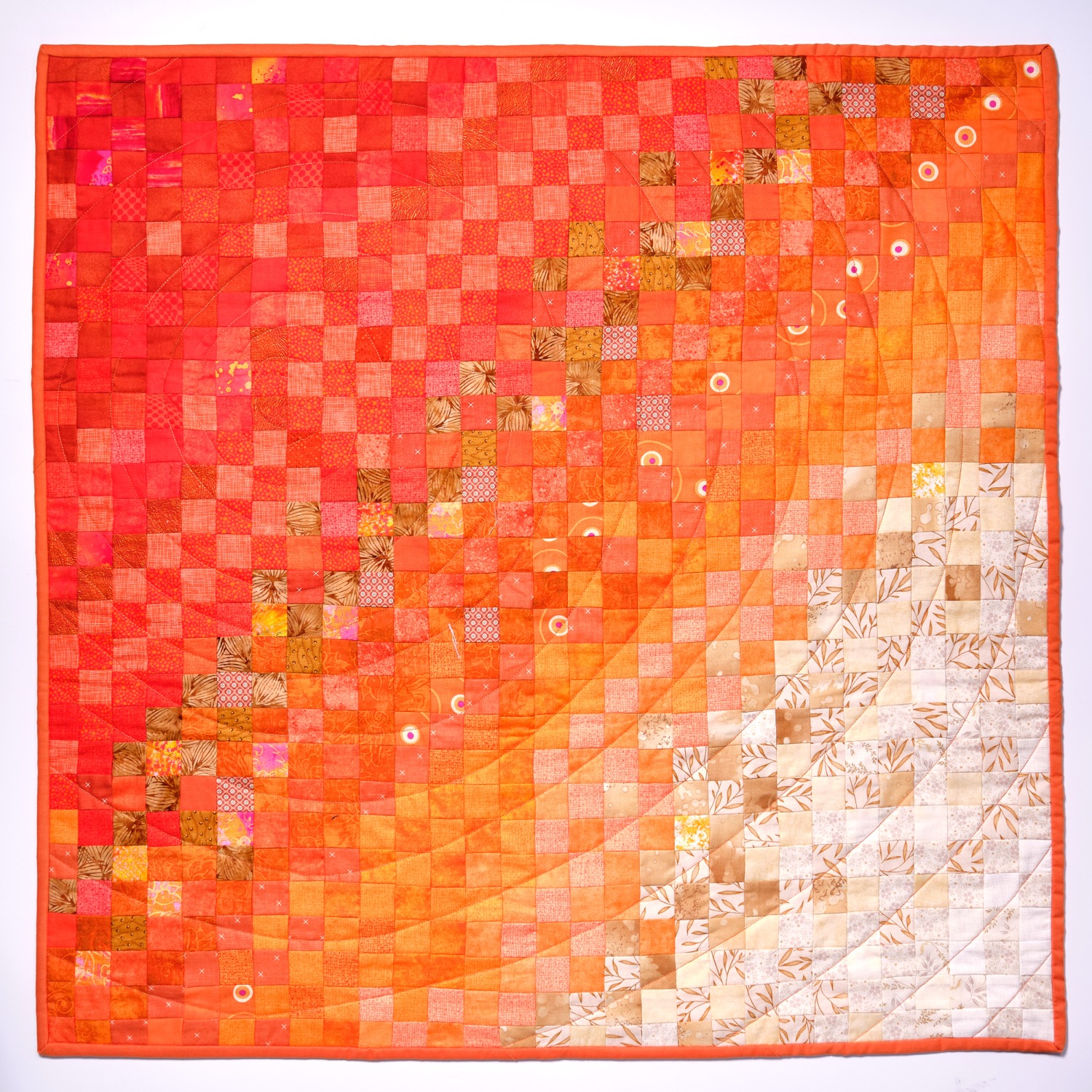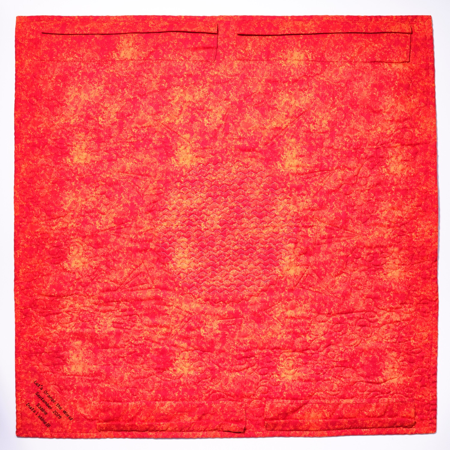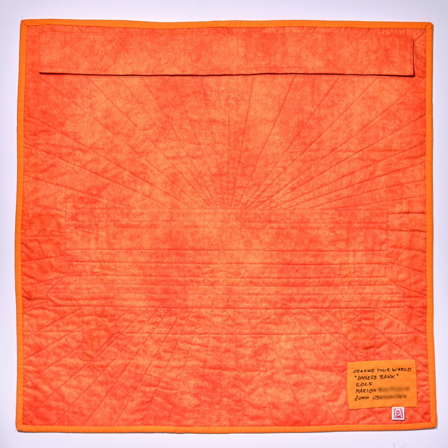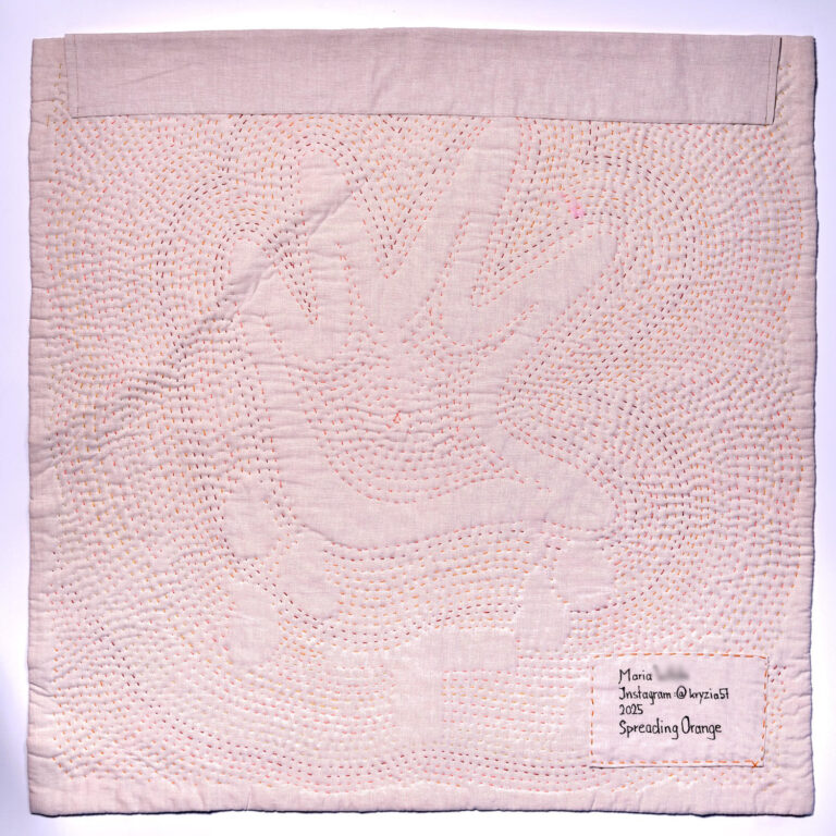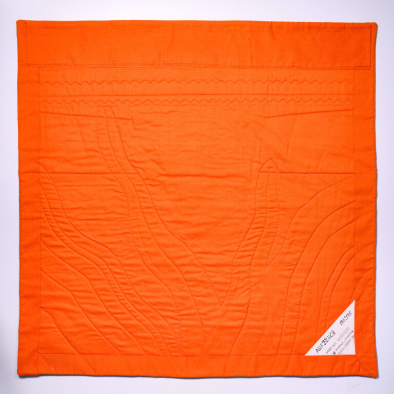 All diese Gedanken verschmelzen in meiner Arbeit in orangen Farbtönen. Orange steht für Warnung und Aufmerksamkeit. Vitalität, Lebensfreude und Optimismus. Kreativität und Neugier. Eine gequiltete Spirale lässt Spielraum für Interpretationen.