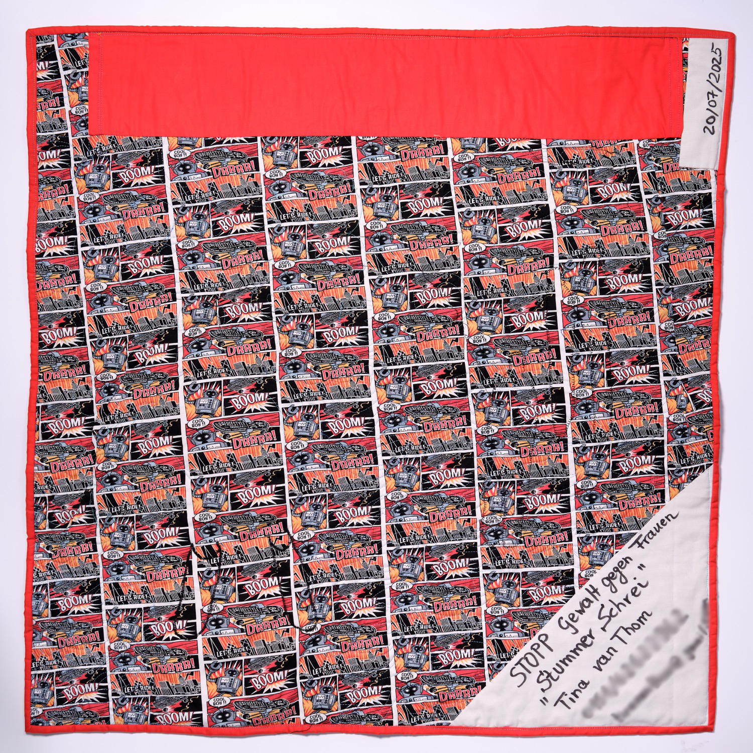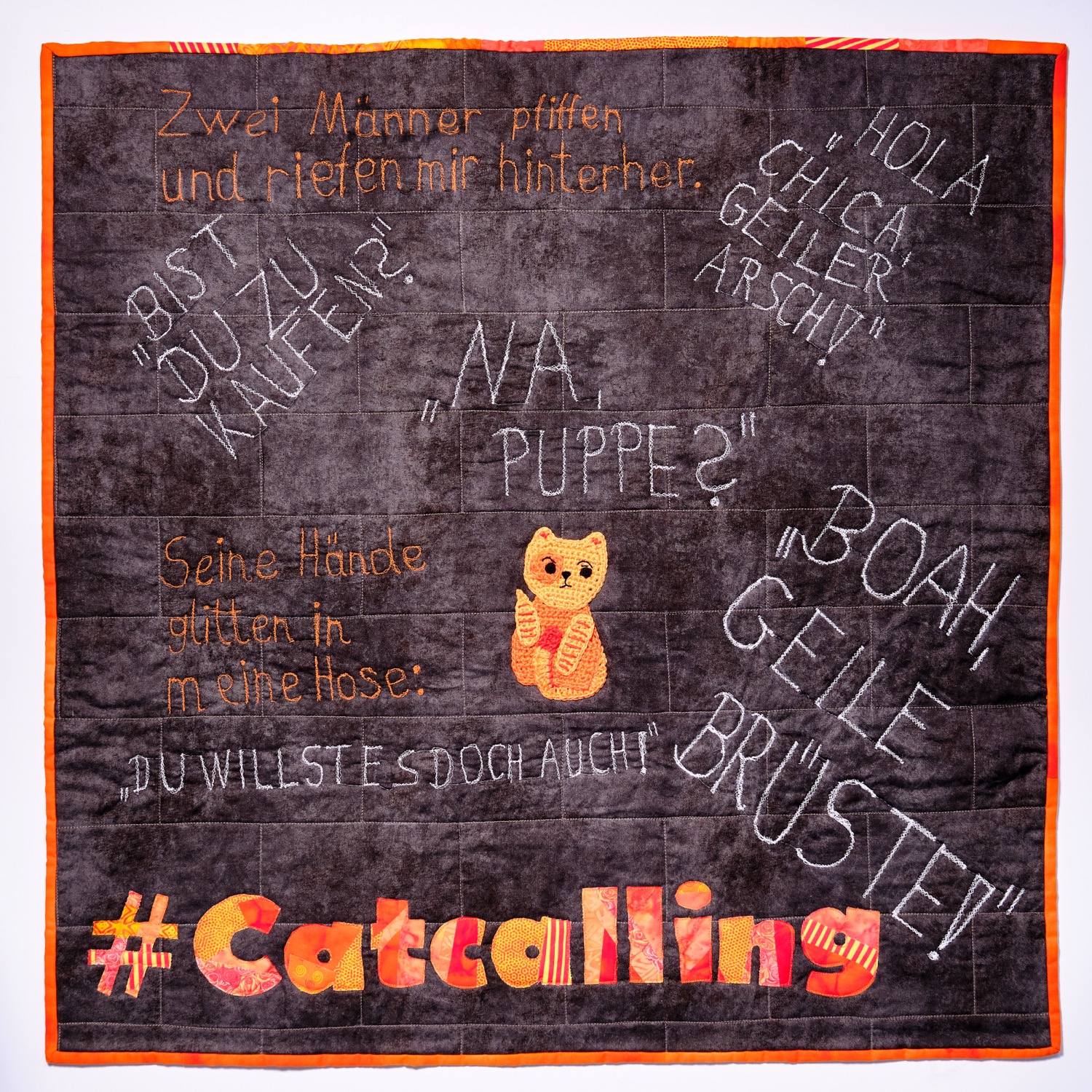 Die Sprüche auf meinem Quilt sind Zitate, die ich auf Fotos im Internet mit dem Suchbegriff “Catcalling” gefunden habe.