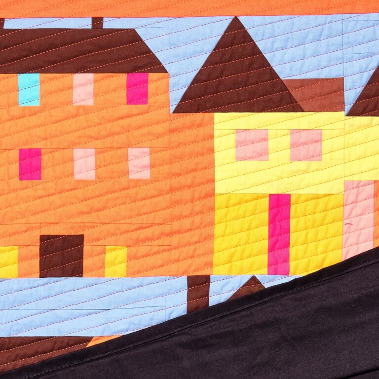 Häusliche Gewalt findet oft im Verborgenen statt, scheinbar unsichtbar für das Umfeld. Mit meinem Quilt möchte ich dieses Thema aufgreifen. Ich habe unterschiedliche Häuser genäht und über diese Häuserreihe wird ein Vorhang hochgehoben. Darunter zeigt sich eine graue, dunkle Welt in der Gewalt gegen Frauen unbemerkt stattfinden kann. Dabei kann Gewalt verschiedene Formen annehmen. Finanzielle Gewalt, psychische und emotionale Gewalt, körperliche Gewalt und auch sexualisierte Gewalt sind unter anderem möglich. Egal welche Gewaltform Anwendung findet, muss die Gesellschaft darauf schauen, dies als strukturelles Problem anerkennen und gesellschaftspolitische Lösungen finden.