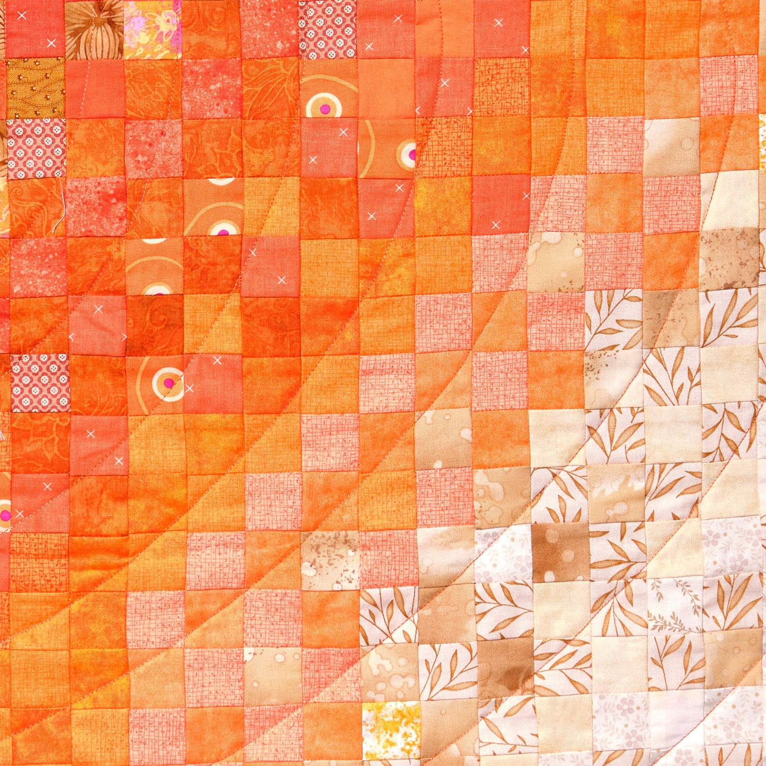 Ich habe aufgrund der kurzen Frist ehrlicherweise Chat-GPT befragt und ein Foto unserer Gruppe mit „unserer“ Bank hochgeladen und um einen orangen Quiltvorschlag unter Nutzung des Motivs gebeten. Und das Ergebnis war erstaunlich gut. Ein Vertiefung der Aufgabe, eine „nähbare“ Quiltvorlage zu erstellen, scheiterte jedoch.