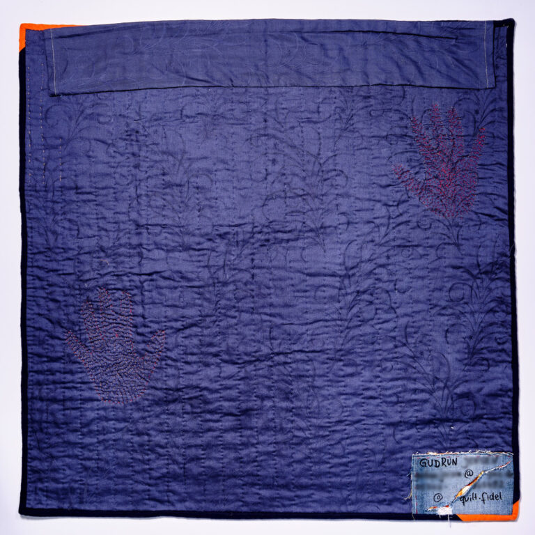 Die Häuser habe ich in der Technik des Foundation Paper Piecings genäht. Die große Hand habe ich auf hellen Stoff mit meiner Hand gedruckt und dann appliziert. Ein Zeichen, dass Gewalt gegen Frauen gestoppt werden muss und ich mich dafür einsetze. Die kleinen Hände habe ich aus Wollfilz appliziert. Auch kleine Gesten helfen eine Haltung in der Gesellschaft zu verstetigen.