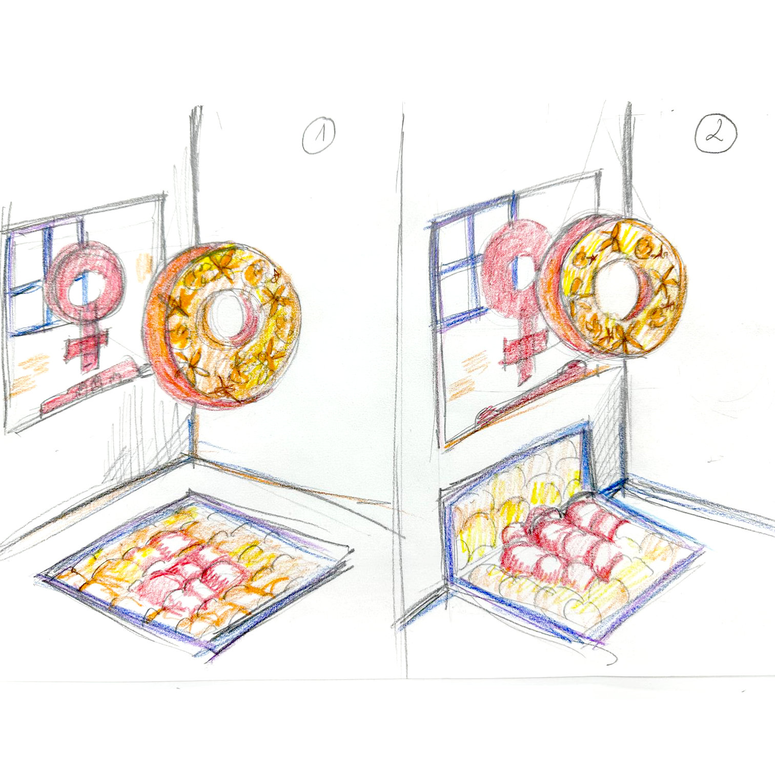 Im Gegensatz dazu steht die Farbe Orange der oberen Häuserreihe für Geborgenheit, Schutz, Unterstützung, Kraft und Widerstandsfähigkeit, für eine Welt, in der Frauen ohne Angst vor Gewalt leben können.
